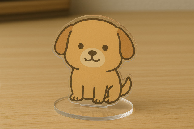 アクリルフィギュアは、キャラクターやデザインをアクリル板に印刷し、カットすることで作られます。